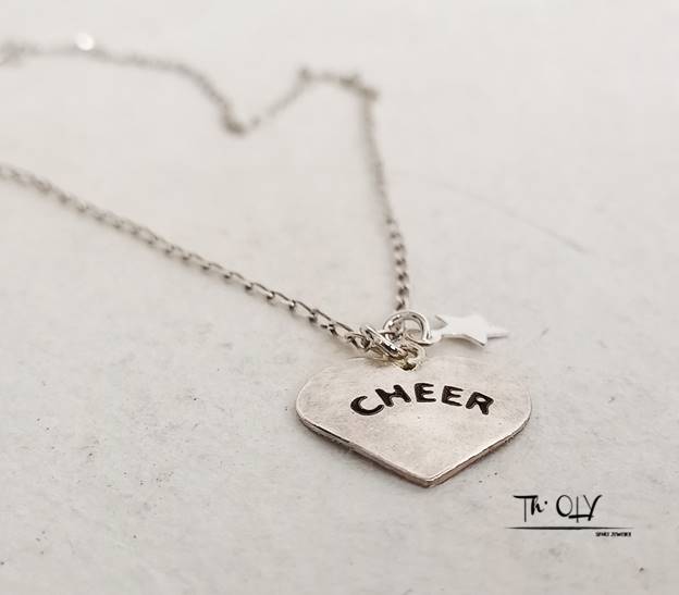 Dije de Corazón con CHEER grabado laser y estrella, representando a las porristas. Elaborado con Plata Ley 925 detalles en Laser. Incluye Cadena de cuentas de diferentes colores