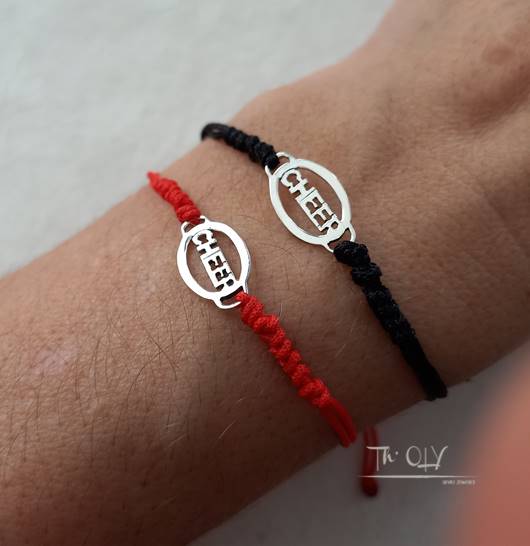 Pulsera para porristas, con la palabra CHEER. Elaborado en Plata Ley 925, tejido tipo macramé rojo o negro.
